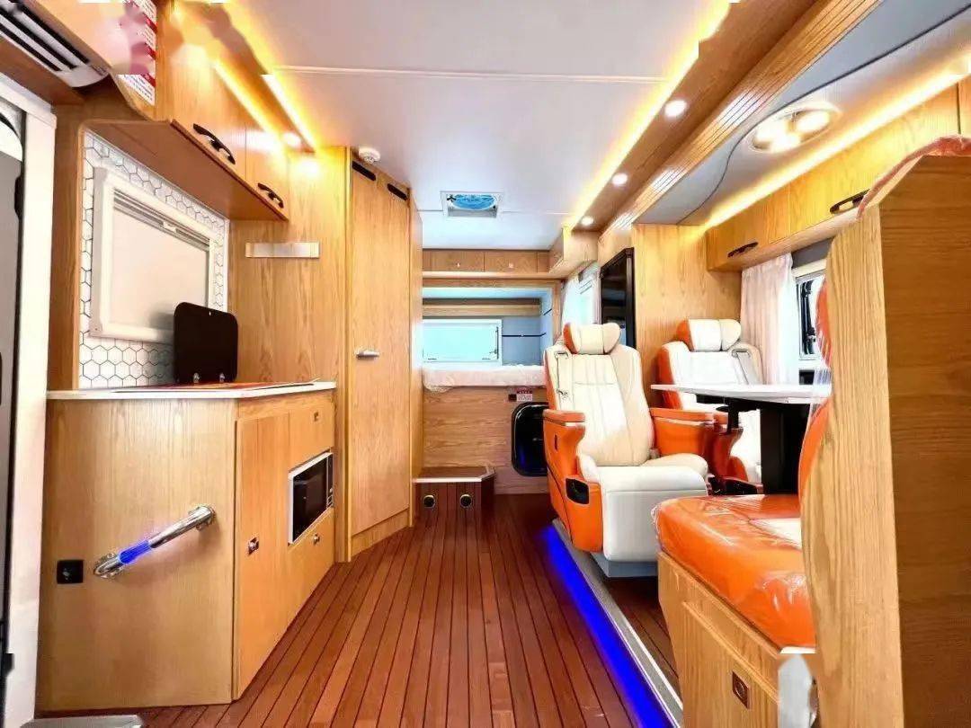 内饰采用大面积木纹辅以橙白双色皮革的组合,得益于拓展机构,车内空间非常宽敞。会客区采用双航空座椅+双人卡座的对向布局,中间是升降餐桌。