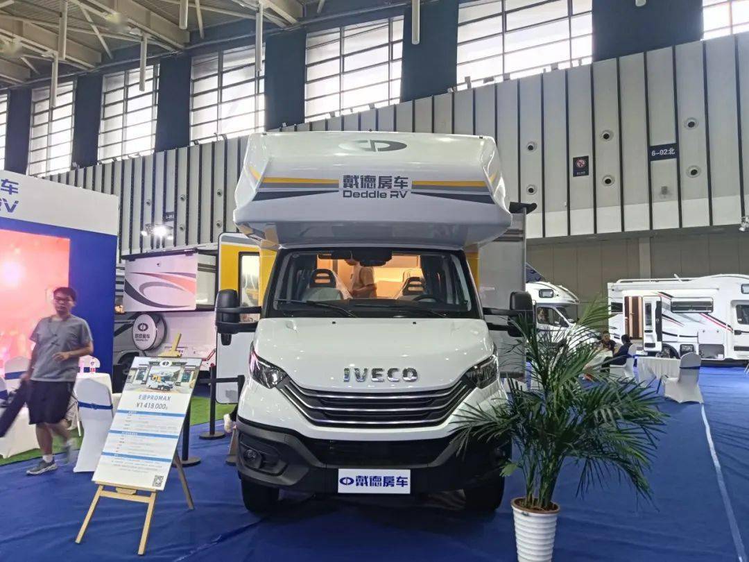 本次在戴德展位最核心的位置展出的是高端房车产品E途PRO MAX双拓展房车。这款房车采用进口依维柯New Daily 6.5T底盘打造,搭配采埃孚8AT全自动变速箱,F1C 3.0T柴油发动机,“龙”式额头设计,降低风阻,提升内部17%使用空间。全车大量开模设计打造,五明治超强墙体保温,冷热都不怕。更有48V储能系统21.5度电,1350w太阳能板,320L内外双净水箱,90L灰水箱,63L黑水箱等。