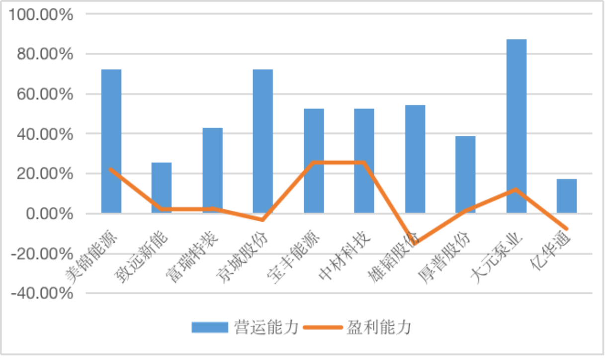 ——市场占有率占比低。从市场占有率维度分析,“氢能源”赛道中宝丰能源、美锦能源、中材科技均有较好表现,分别达到了31.58分、28.94分、27.00分,而大元泵业的相对市场位势分值仅为1.99分(见图3),与别的企业有较大差异。因此,大元泵业应当加强品牌营销,扩大知名度,提高市场竞争力。同时也不难发现,该赛道内的相对市场位势内部差别很明显,分布极不平衡,头部效应明显。
