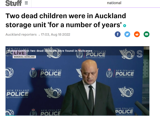 8月11日,奥克兰一户人家购买的行李箱内发现儿童遗骸。新西兰“Stuff”网站称,行李箱是这户人家从一个在线拍卖会上所得,他们拍下了一个储物库房内的物品,有整整一拖车各类产业,其中就包含这些行李箱。
